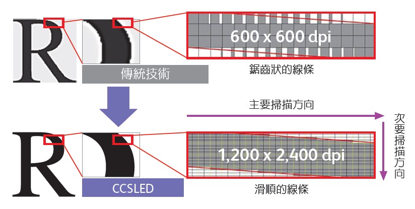 •快速色彩修正 IReCT 影像定位控制技術(shù),以超精細(xì)的畫素控制精準(zhǔn)修正失真的影像,將畫素填入縫隙中,使鋸齒狀的邊緣更加平滑,提升個別字元與細(xì)線的列印品質(zhì)。